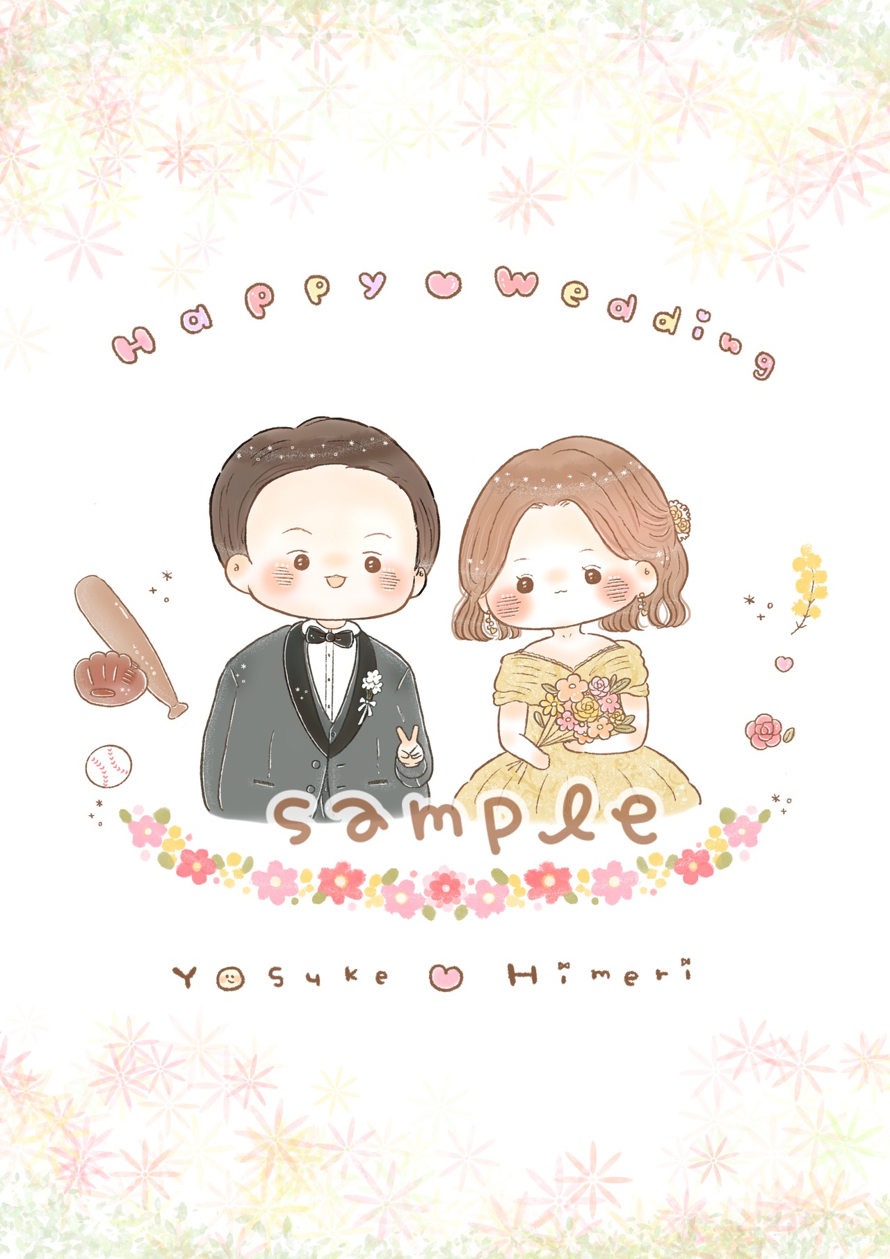 ゆるい似顔絵のかわいいウェルカムボードを作成します。お目々は丸いタイプかキラキラしたデフォルメタイプのどちらかお選びできます。